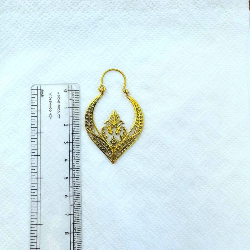 These striking tribal brass earrings feature an elegant leaf-like form with a softly pointed base and flowing inner filigree lines. The symmetrical openwork design creates a sense of movement and lightness, while the warm brass tone enhances the handcrafted feel.