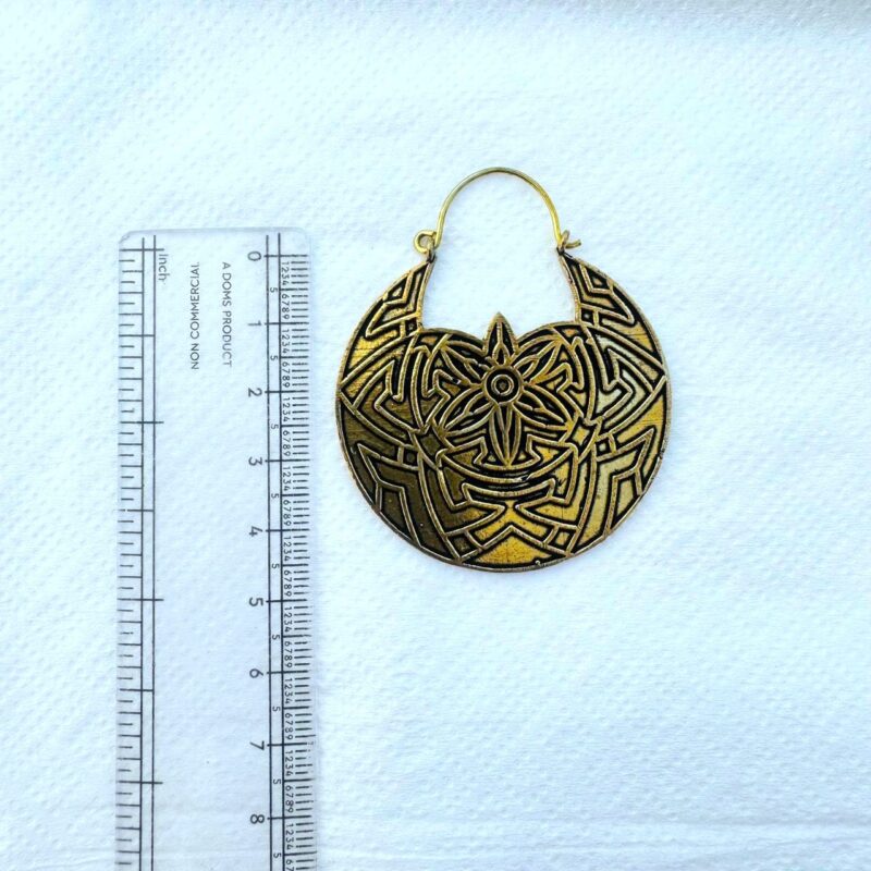 These round mandala brass earrings feature an intricate engraved pattern inspired by sacred geometry and tribal motifs. Finished in a warm gold tone, they offer a powerful yet elegant statement, combining symbolism with artistic craftsmanship.
