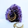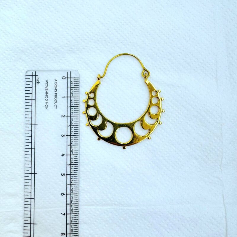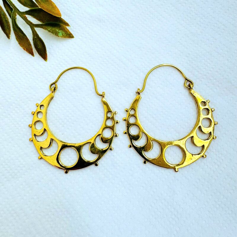 These elegant brass crescent hoop earrings feature a smooth, polished crescent shape accented with circular cut-outs and tiny raised dot details along the edge. The design is simple yet distinctive, drawing inspiration from lunar symbols, tribal jewelry, and ancient ethnic forms.