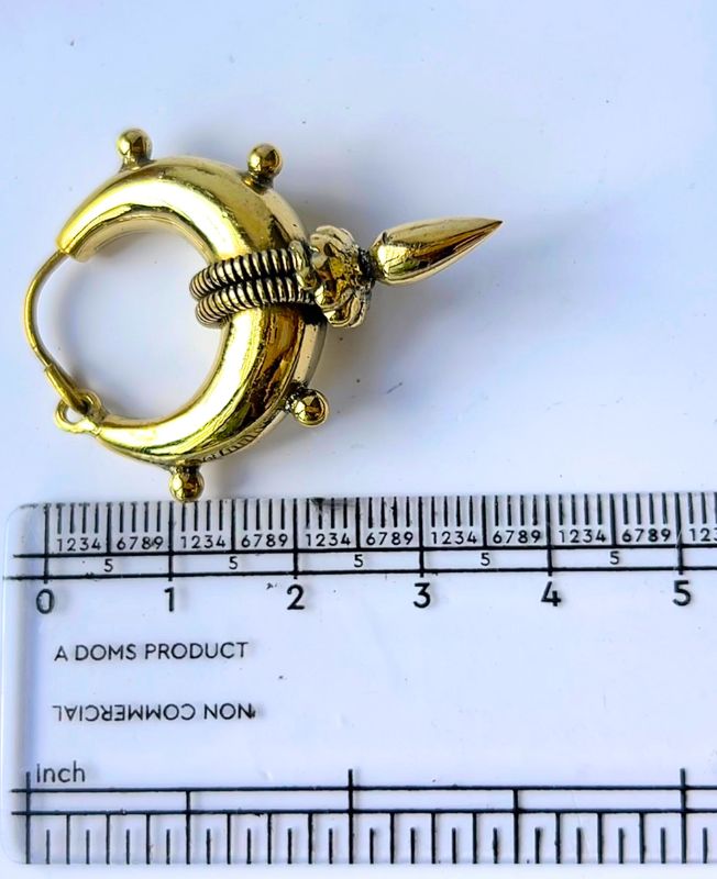 A dramatic earring crafted from brass with a vintage gold finish, this piece is shaped like a bold crescent and features delicate round studs all along its edge. A detailed spike drop enhances its tribal and warrior-inspired aesthetic.