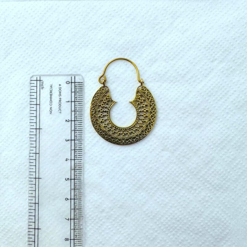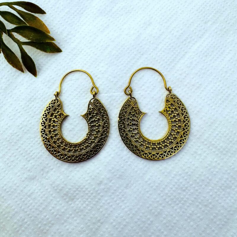 These beautiful brass earrings feature a classic crescent silhouette enriched with intricate filigree and dotted detailing. The symmetrical openwork design creates a rich texture while keeping the earrings lightweight and comfortable to wear. Inspired by tribal and ethnic jewelry traditions, this design brings timeless character with a warm, golden brass finish.