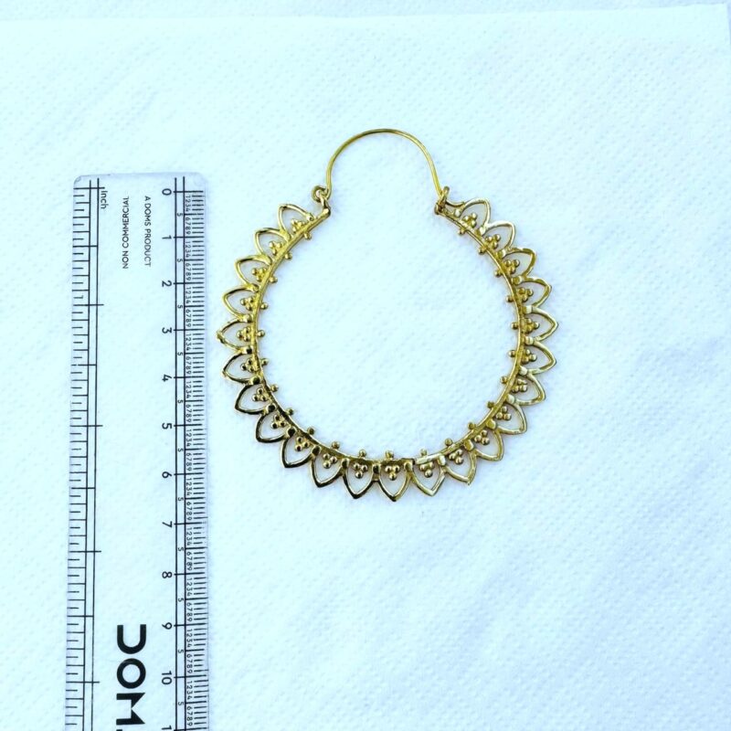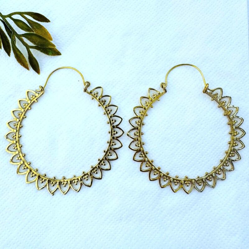 These petal filigree brass hoop earrings feature a graceful circular shape enhanced with repeating lotus-like petals and subtle dotted accents along the lower edge. The openwork design keeps them airy and comfortable while adding rich texture and handcrafted character.
