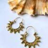 These radiant tribal hoop earrings feature a stunning sunburst-inspired design, blending intricate detailing with a bold golden finish. Handcrafted to evoke traditional aesthetics, each piece adds a touch of heritage and charm to any jewelry line.