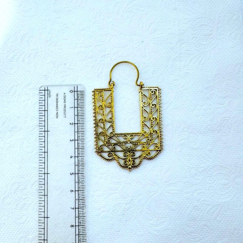These statement brass earrings showcase a striking rectangular silhouette adorned with delicate, hand-inspired filigree scrollwork. The open geometric frame combined with ornate curves creates a beautiful contrast between structure and softness, making these earrings both bold and elegant.