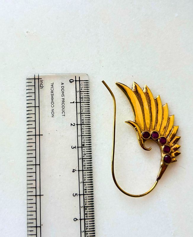 A stunning handcrafted brass ear cuff designed in the shape of an elegant wing, adorned with deep red stones for a bold, artistic statement. Perfect for boho, fantasy, or statement jewelry lovers.