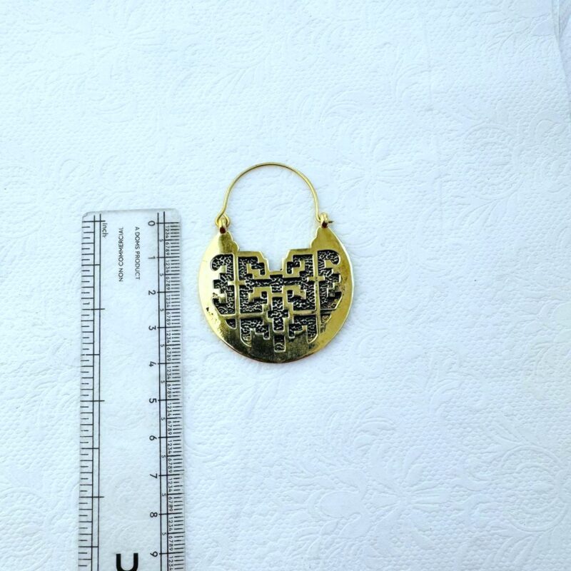 These striking brass earrings showcase a smooth circular hoop base accented with a central sacred geometry inspired cut out pattern. The clean, symmetrical motif creates a strong visual contrast against the warm golden brass surface, giving the earrings a modern yet timeless character.