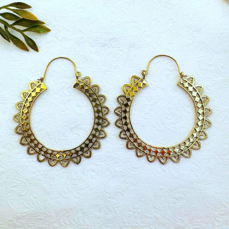 These Brass Scalloped Tribal Hoop Earrings feature a bold open-hoop silhouette enriched with intricate geometric cut-outs and a decorative scalloped border. The layered pattern creates depth and movement while keeping the earrings airy and comfortable to wear.