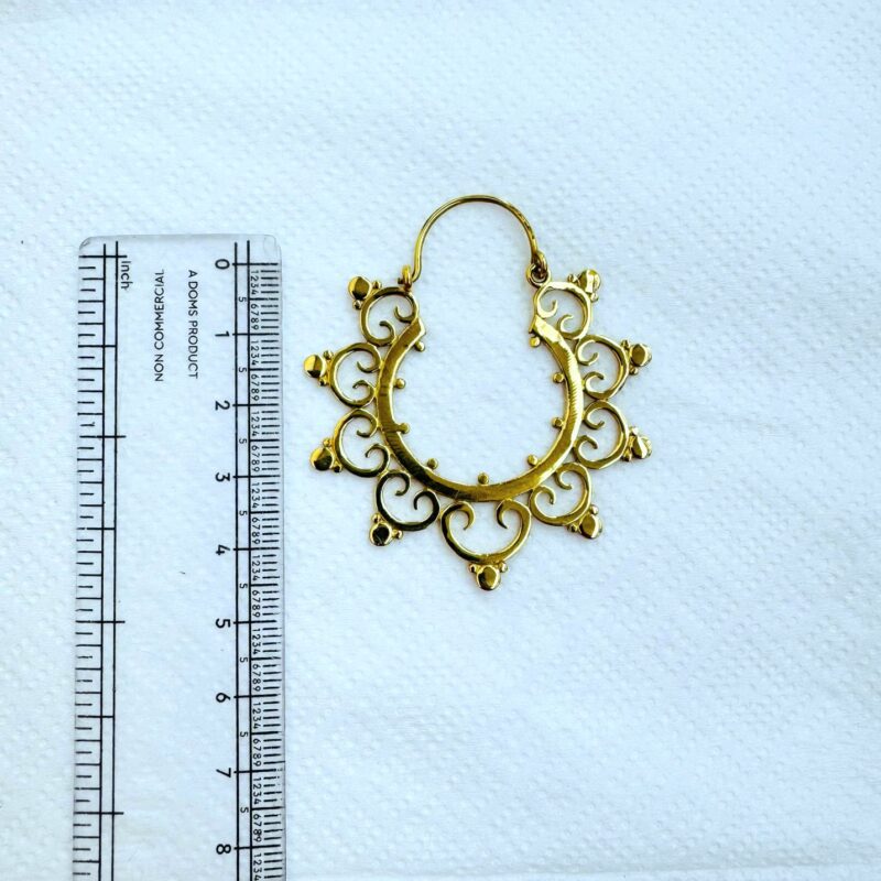 Handcrafted gold plated brass earring featuring an intricate scrollwork details and small decorative drops, inspired by tribal and ancient ethnic jewelry. Lightweight and perfect for a bold yet elegant look.