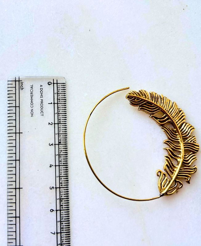 Elegant brass hoop earrings featuring a detailed feather motif, blending natural inspiration with bold bohemian style. Perfect for adding a touch of artistic charm to any outfit.
