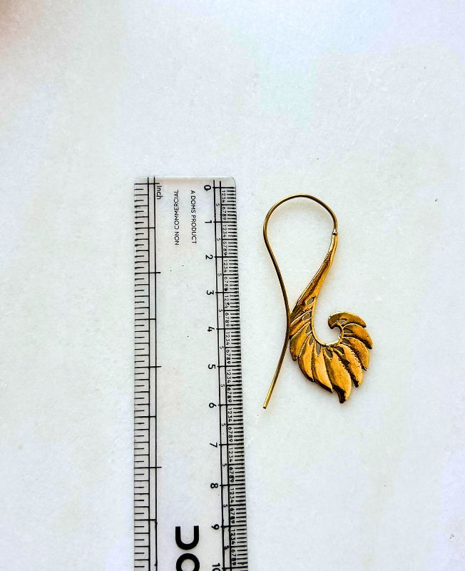 Elegant handcrafted brass earring in a spiral wing design, featuring detailed feather-like curves that create a bold and artistic statement look.