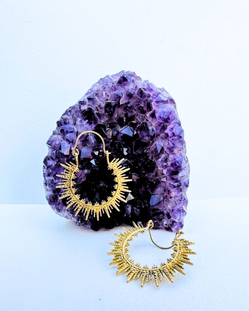 These brass sunburst hoop earrings are designed to make an impact. Featuring evenly spaced pointed spikes radiating from a curved hoop, they evoke solar, tribal, and warrior-inspired symbolism, representing strength, energy, and light.