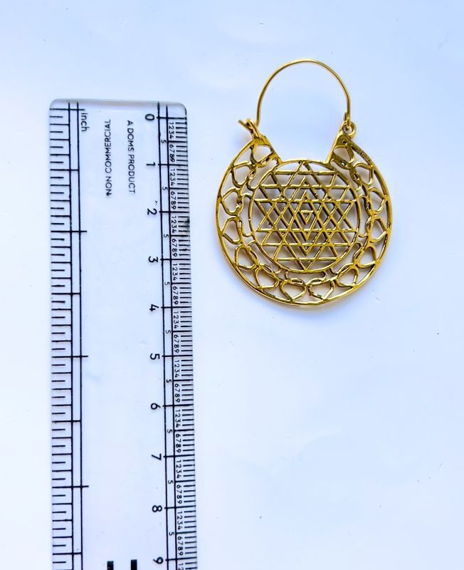 Elegant brass earrings featuring a stunning Sri Yantra-inspired sacred geometry design, symbolizing harmony and spiritual balance, perfect for bohemian and ethnic styles.