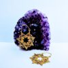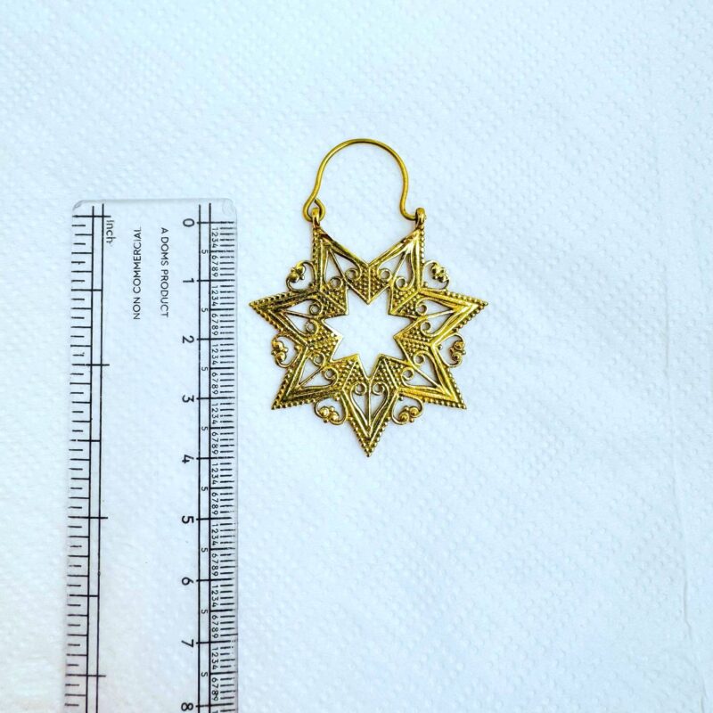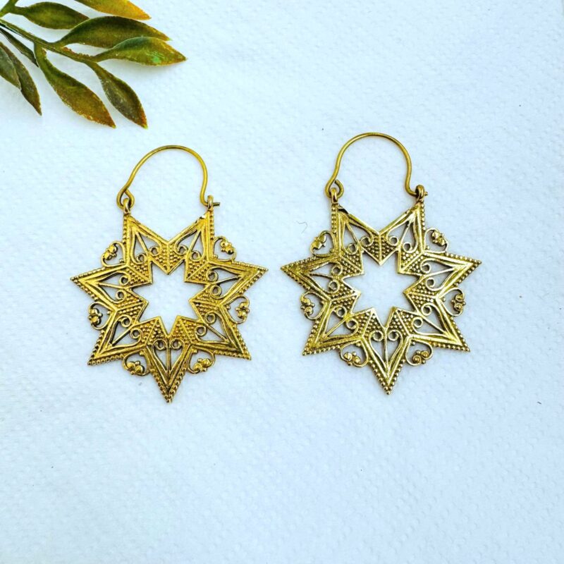 These brass star mandala earrings are inspired by sacred geometry and traditional ornamental patterns. The eight-point star shape is carefully crafted with detailed filigree lines, dotted textures, and delicate curves that create a striking yet balanced geometric form.