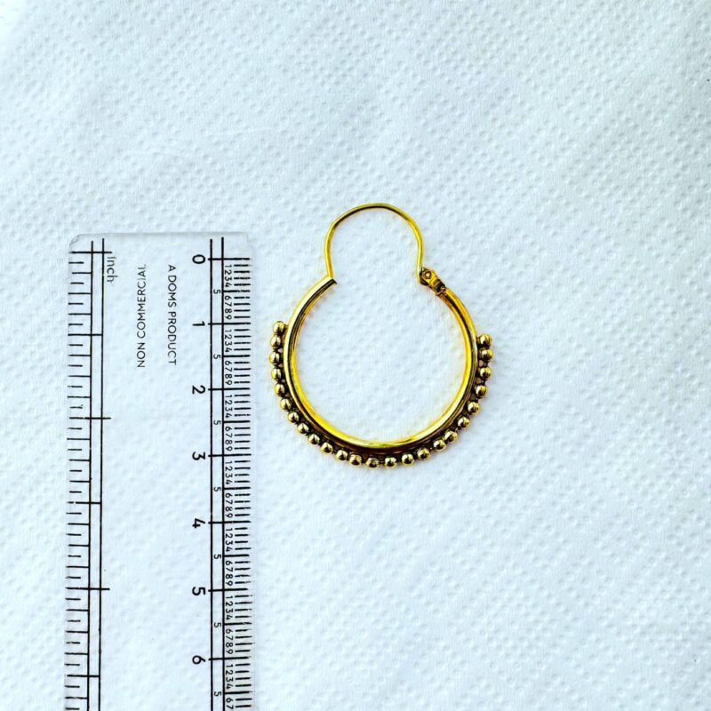 These earrings feature a stunning textured finish that highlights the warmth of the brass. The outer curve is meticulously adorned with small, polished brass beads, creating a rhythmic, scalloped effect that adds depth and character to the traditional hoop shape.