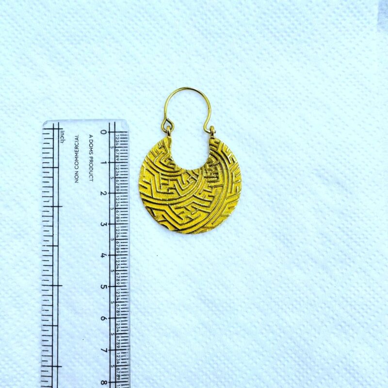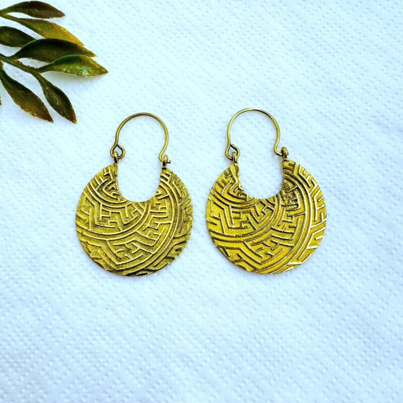 These brass tribal disc earrings showcase a beautifully engraved maze-inspired pattern, giving them an ancient, symbolic feel. The slightly irregular round shape and textured surface add depth and character, while the clean hook design keeps them lightweight and easy to wear.
