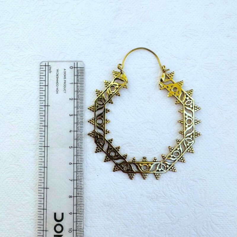 These crescent brass hoop earrings are a striking statement piece, combining traditional craftsmanship with a bold, contemporary silhouette. The openwork crescent form is adorned with rhythmic cutout patterns and raised bead accents along the outer edge, creating depth, texture, and visual movement.