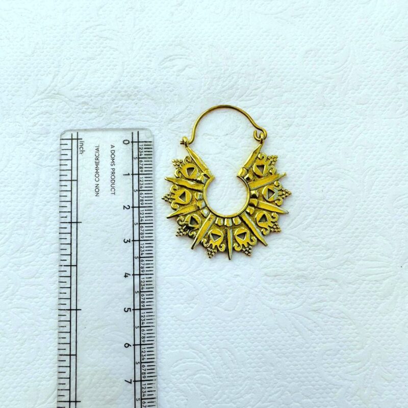 These bold brass earrings feature a striking sunburst silhouette enriched with geometric cut-outs and textured details. The layered tribal pattern radiates outward from the hoop, creating depth, movement, and a strong visual presence while remaining lightweight and wearable.
