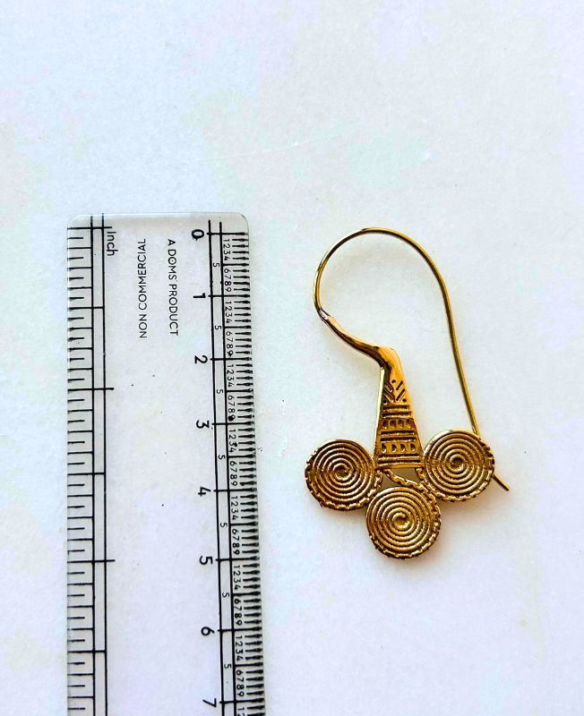 Elegant handmade brass earrings featuring a triple spiral filigree pattern inspired by tribal artistry. Lightweight, intricate, and full of vintage charm.