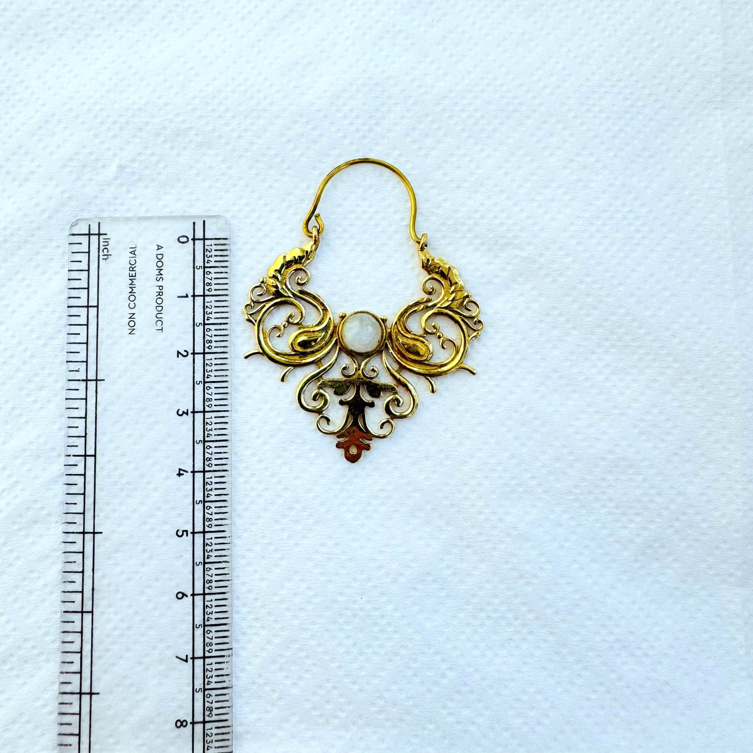 Handcrafted gold plated brass earring featuring a flowing ornamental design and a white natural stone center piece. Lightweight and perfect for a bold yet elegant look.