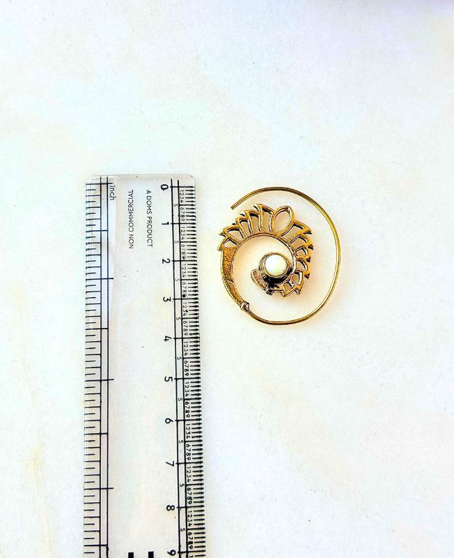 This handcrafted brass spiral earring embodies traditional artistry with a modern twist. The earring showcases an intricate tribal-style spiral design that gently curves into a circular shape, symbolizing infinity and balance. At its center sits a smooth white stone that adds contrast and harmony to the golden tones of the brass.