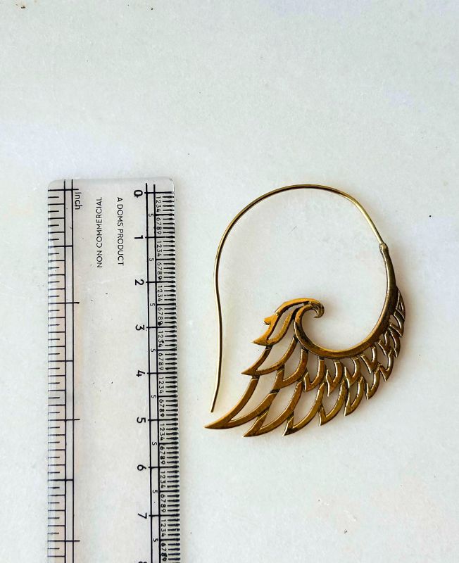 This stunning brass earring is artistically shaped like a wing, showcasing a layered feather design with intricate openwork detailing. The natural golden tone of the brass highlights the sculpted edges, giving it an airy yet bold appearance.