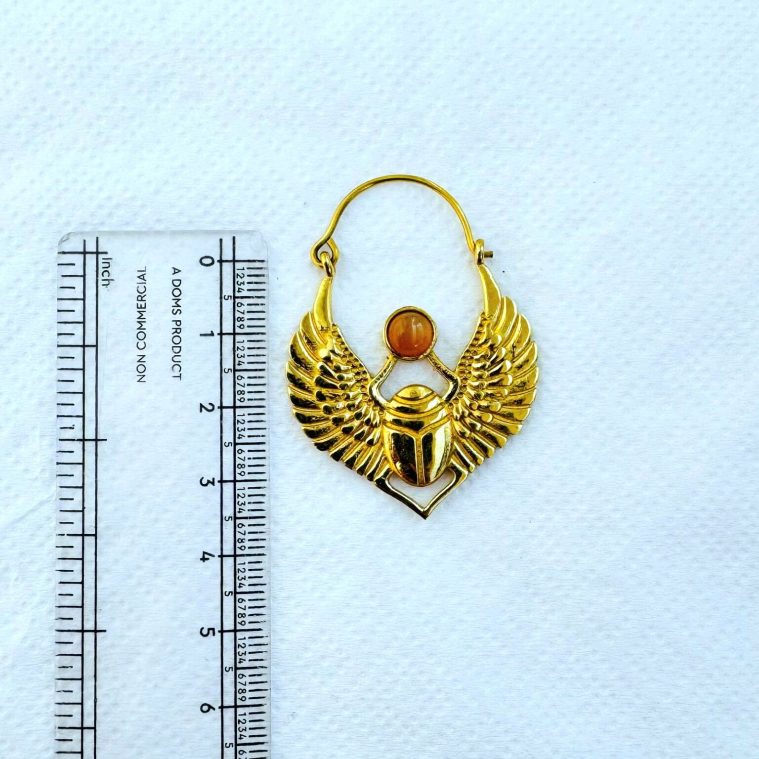 Handcrafted gold plated brass earring featuring a winged scarab design with a warm amber colored stone. Lightweight and perfect for a bold yet elegant look.