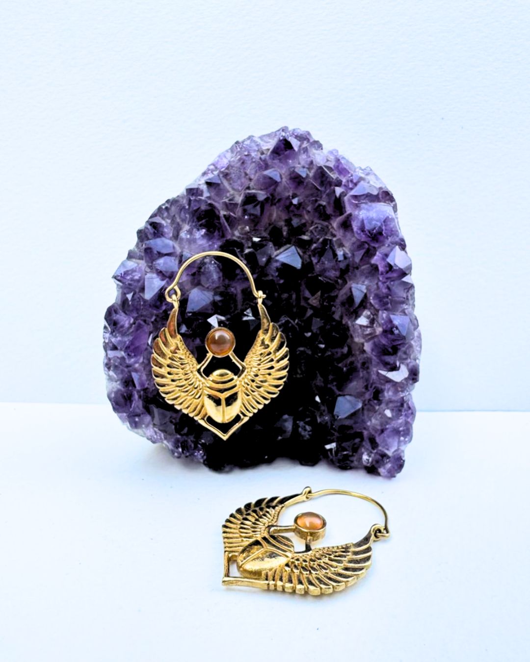 These handcrafted winged scarab brass earrings are inspired by ancient Egyptian symbolism, where the scarab represents protection, rebirth, and transformation. The detailed spread wings create a bold and striking silhouette, while the central scarab form adds depth and meaning to the design.