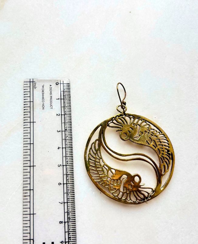Elegant brass earrings inspired by the Yin Yang symbol, featuring two intricately carved phoenix birds representing balance and transformation. A beautiful blend of symbolic meaning and artistic craftsmanship.