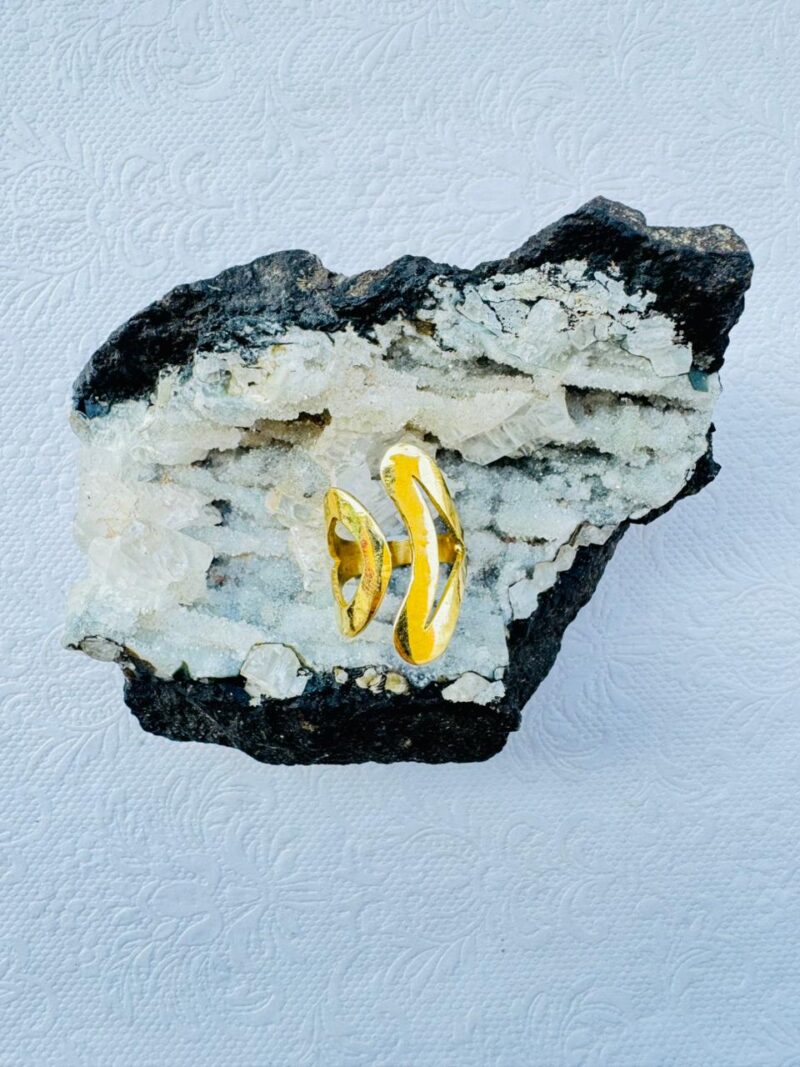 A bold, modern brass statement ring featuring flowing, abstract lines and an openwork infinity-inspired silhouette.