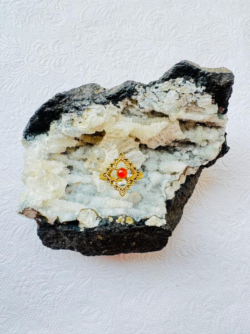 Elegant handcrafted brass ring featuring an intricate lattice frame with a vibrant carnelian stone centerpiece. Perfect for bohemian, ethnic, or artisan jewelry lovers.