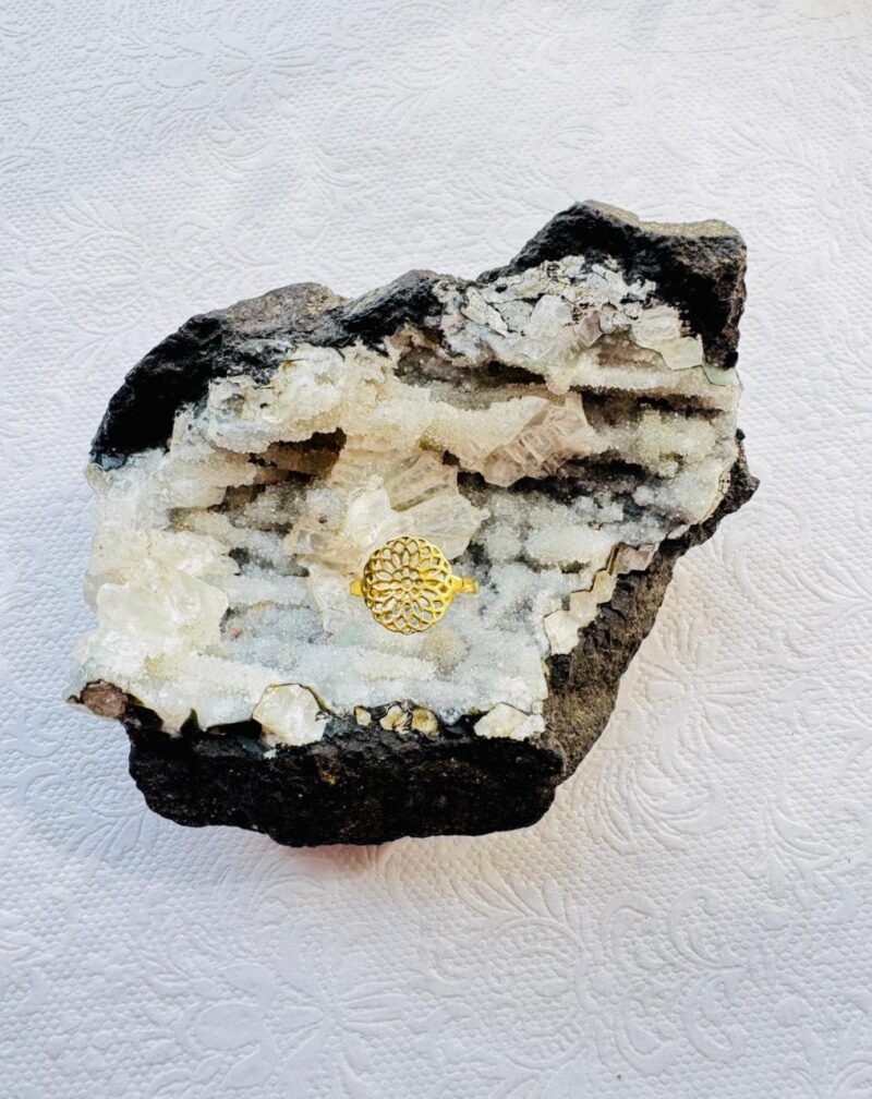 A gold-colored ring featuring a flat, circular face with an intricate openwork mandala or floral lace design, displayed on a purple amethyst crystal.
