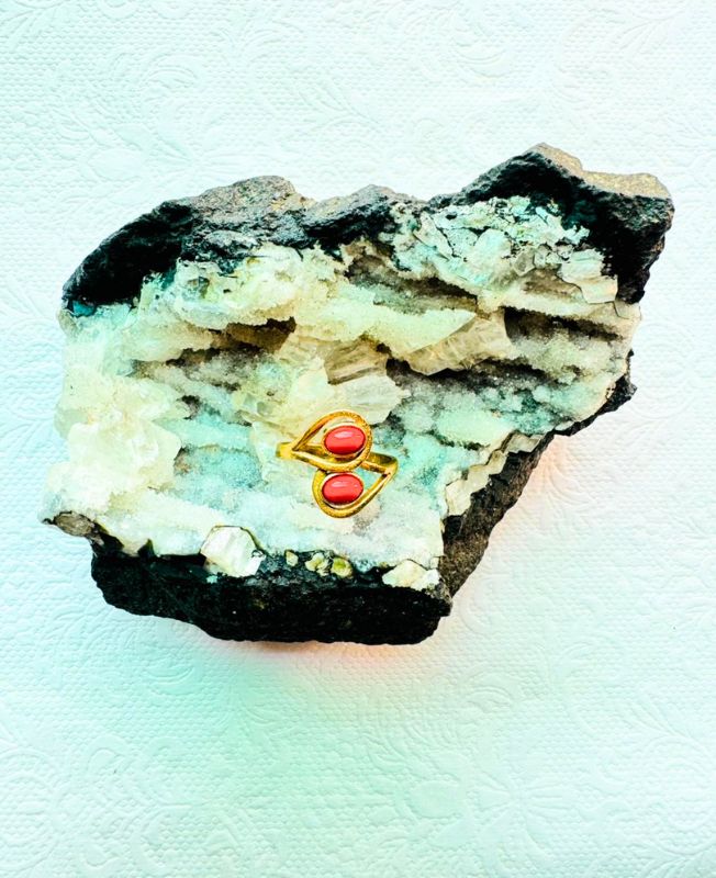 Elegant handcrafted brass ring featuring two oval coral red stones set in a mirrored open design. The adjustable band ensures a comfortable fit for any size, perfect for bohemian and artistic jewelry styles.