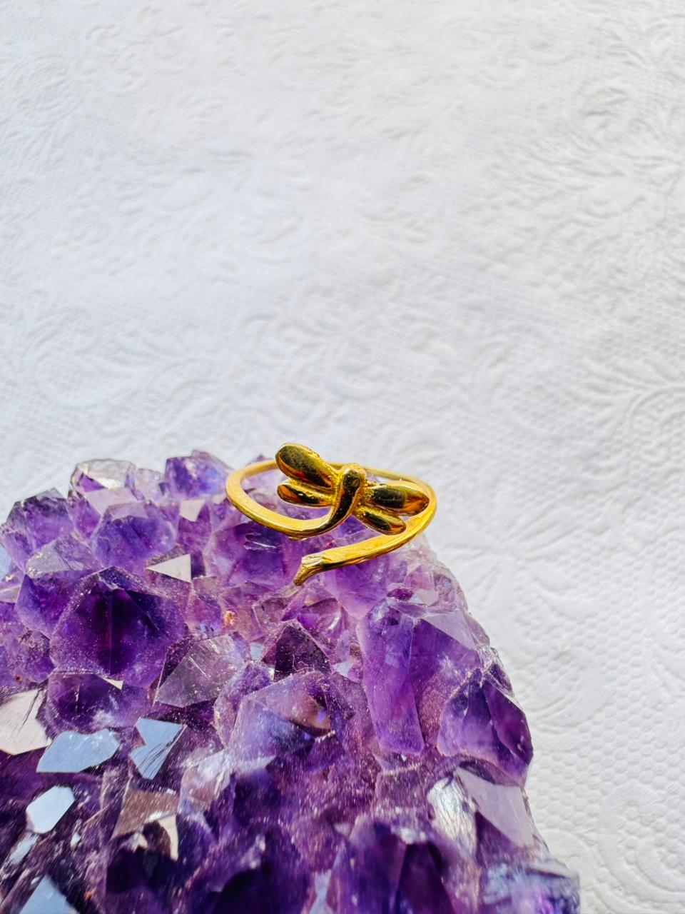 An adjustable gold-colored bypass ring featuring a polished sculptural dragonfly motif, resting on a purple amethyst crystal cluster.