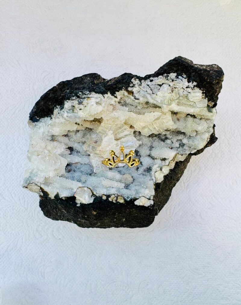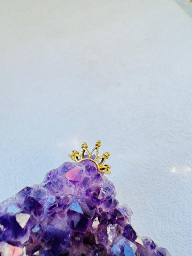A delicate gold-colored ring featuring a five-point crown or tiara motif with small beaded accents, resting on a purple amethyst crystal.