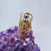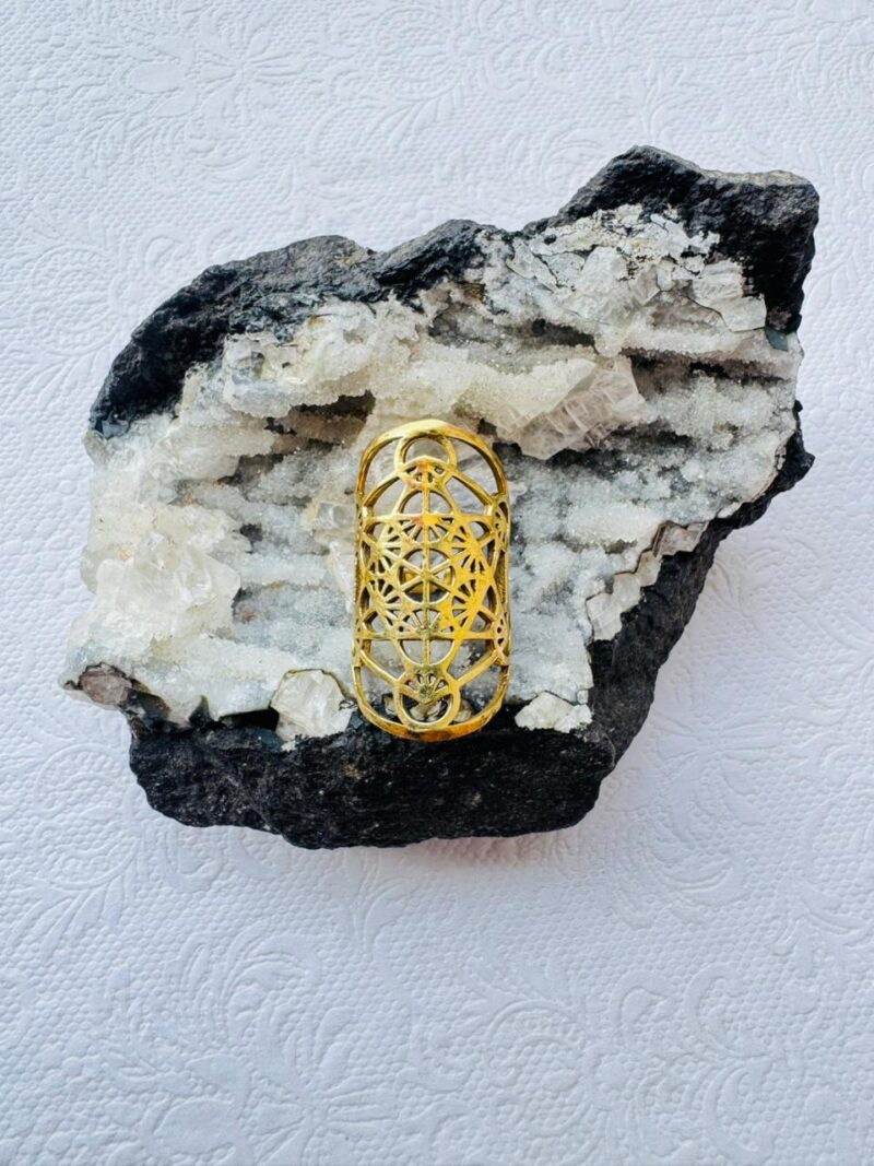 An elongated, gold-colored cigar-style band featuring an intricate openwork pattern of the “Flower of Life” sacred geometry, resting on a purple amethyst crystal.