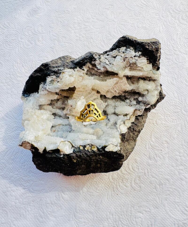 A polished gold-colored ring featuring a structured, peaked arch design with geometric openwork, displayed on a purple amethyst crystal.