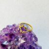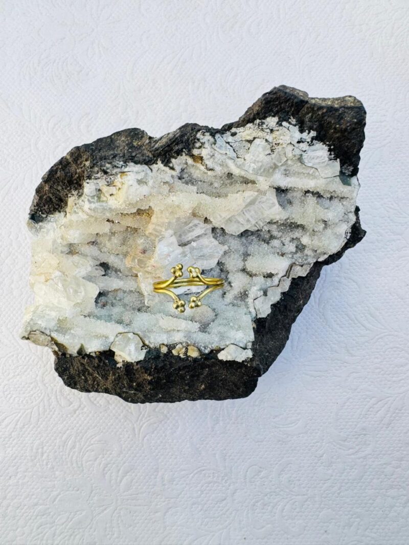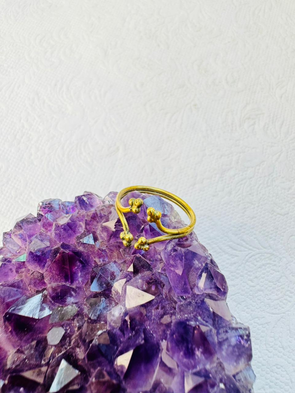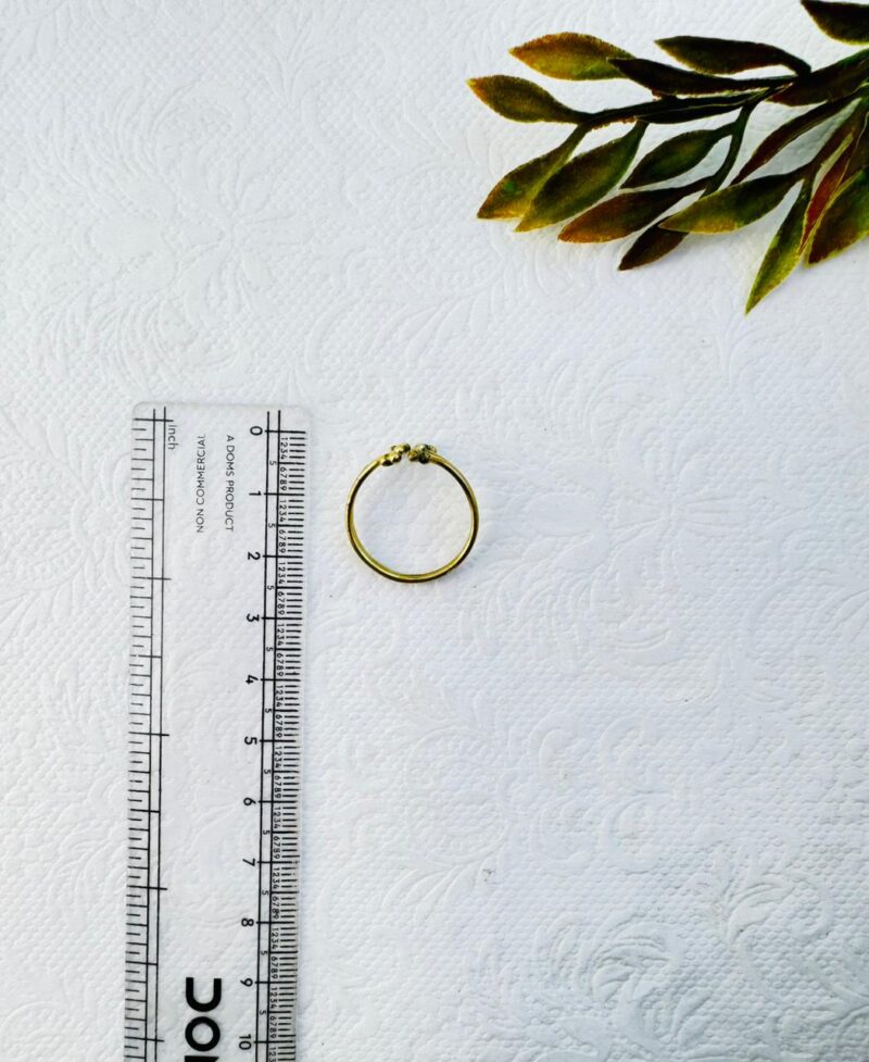 An adjustable gold-colored bypass ring featuring two parallel bands that curve toward each other, each tipped with small clusters of metallic beads.
