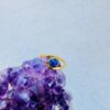 A polished gold-colored ring featuring a round blue lapis lazuli cabochon framed by a swirling, curved band design, resting on a purple amethyst crystal.