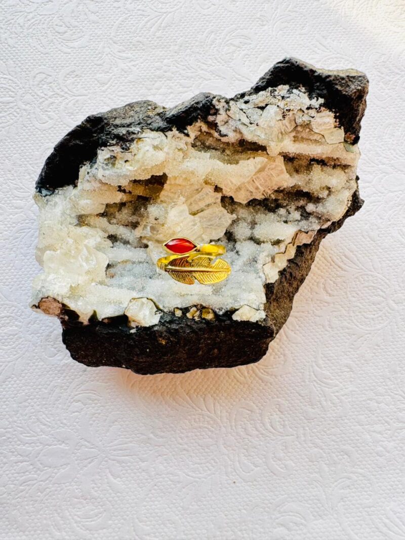 Elegant handcrafted brass ring featuring a feather motif wrapped delicately around a vivid red stone. Adjustable and lightweight, this artisan-made piece is perfect for bohemian, tribal, or everyday wear.