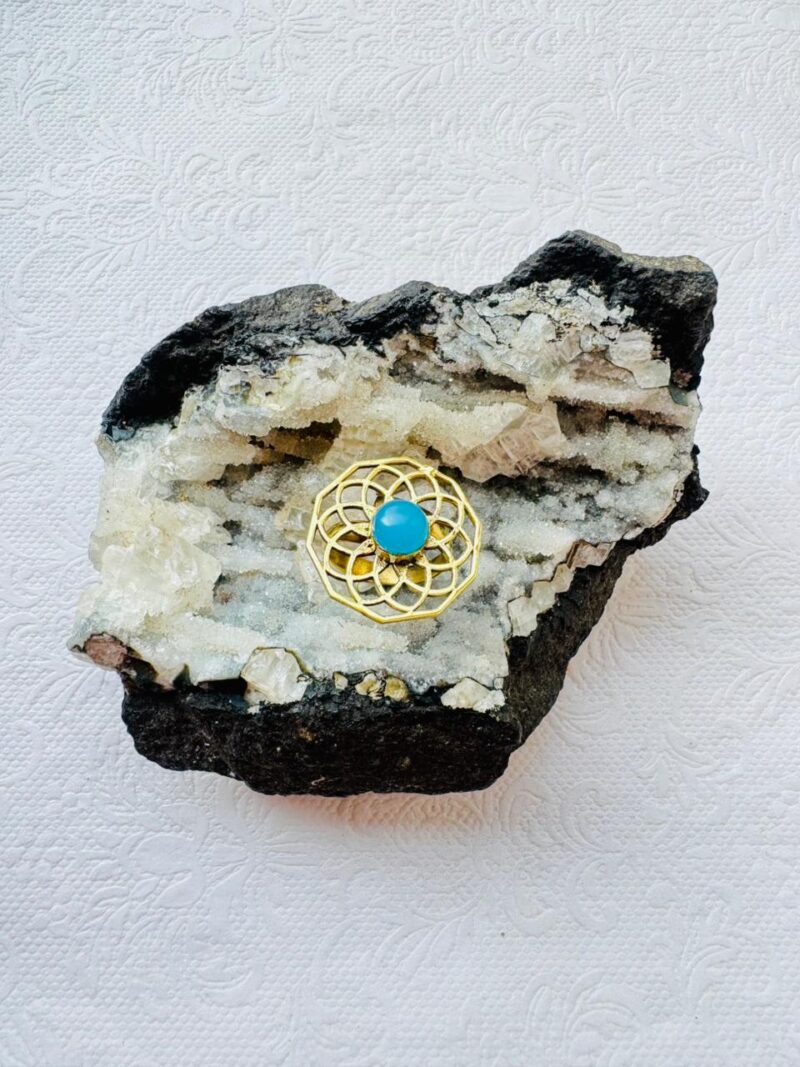 This beautifully crafted Lotus Grid Brass Ring showcases intricate open filigree work symbolizing balance and harmony. At its center lies a smooth turquoise stone, representing protection, communication, and serenity. Each ring is artisan-made in India with premium-quality brass and hand-polished for a warm golden glow.