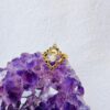 An adjustable gold-colored ring featuring a central round moonstone cabochon set within an intricate, diamond-shaped filigree frame, resting on a purple amethyst crystal.