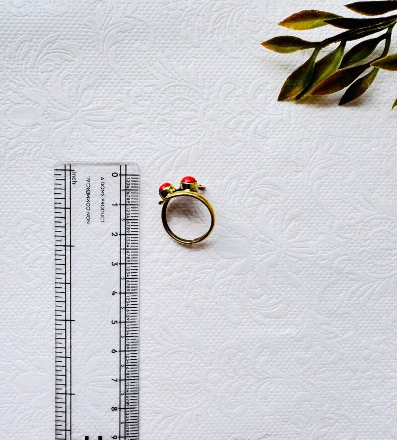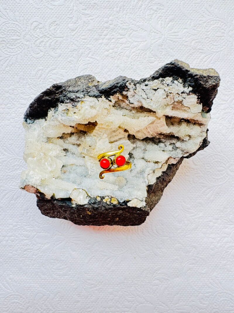 Handcrafted brass ring with a graceful spiral motif, featuring two vivid red enamel stones. Adjustable open-back design ensures a comfortable fit for all sizes.