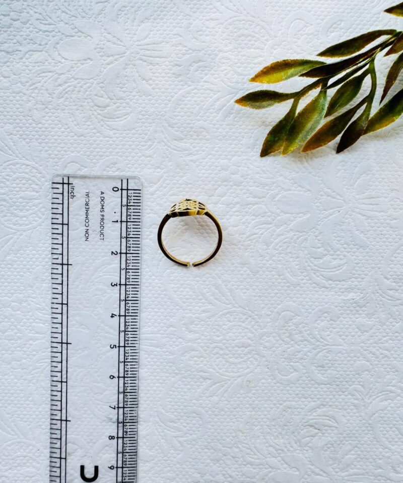 This jewelry piece is a gold-tone ring with a prominent circular focal point showcasing a sacred geometry design. The design is composed of several overlapping circles that create a symmetrical, flower-like pattern known as the Seed of Life. The ring’s face is crafted with an openwork style, allowing the light to pass through the gaps between the metal lines.