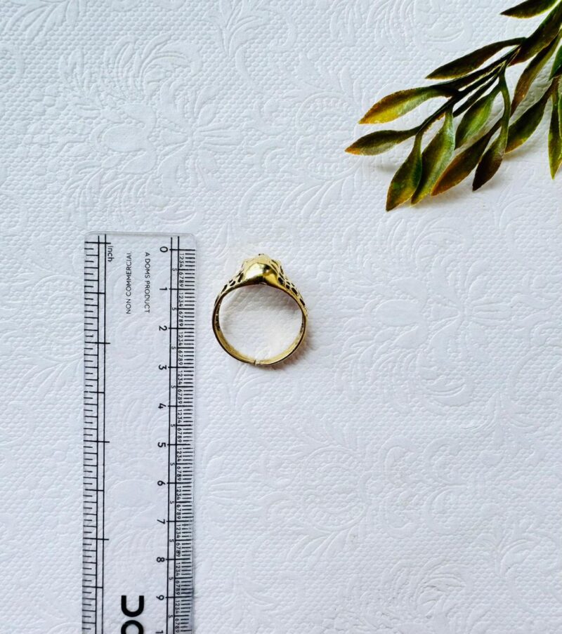 This striking brass skull ring combines detailed craftsmanship with a touch of mystique. Cast in solid brass, the openwork skull design is enhanced with vivid purple stone inlays that catch the light beautifully. The ring’s band is adjustable, allowing for a comfortable fit on various finger sizes.