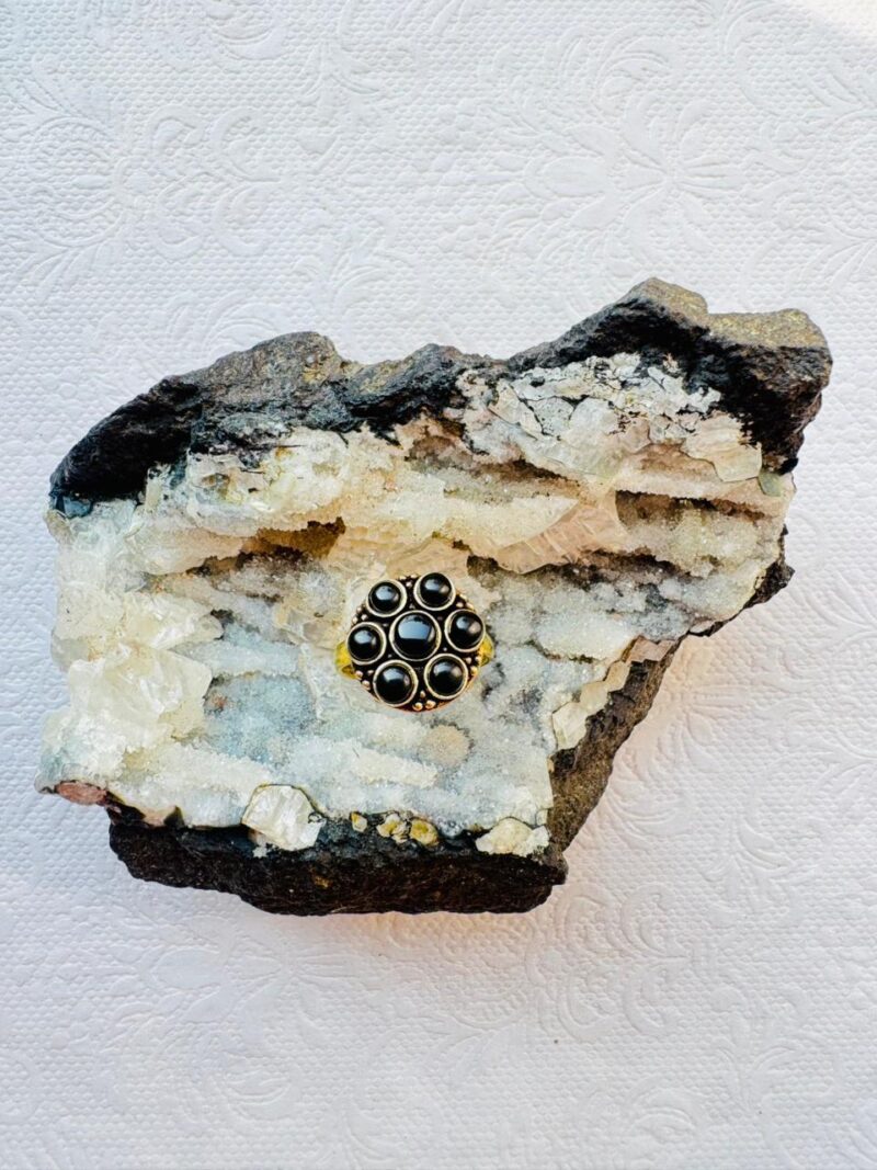 This stunning brass statement ring showcases seven beautifully polished black onyx stones set in a circular arrangement. The rich, deep tones of the stones contrast gracefully with the warm gold hues of the brass, creating a piece that’s both powerful and refined.