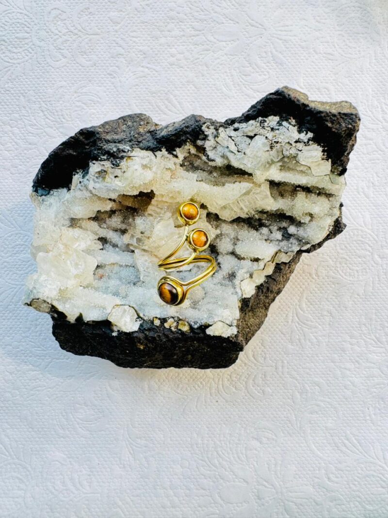 A gold-colored bypass ring featuring three round tiger’s eye cabochons set in a tiered spiral design, resting on a purple amethyst crystal.