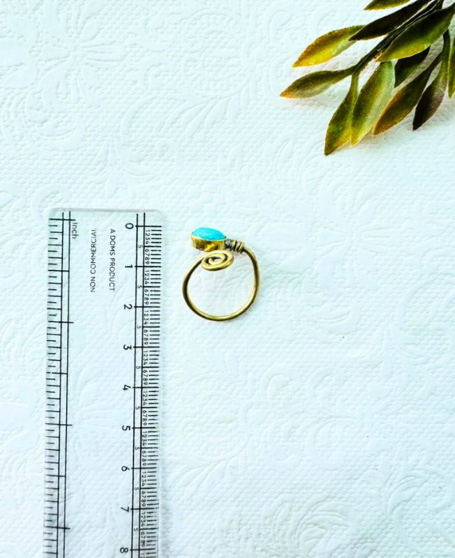 This beautiful spiral brass ring showcases a genuine turquoise gemstone, symbolizing protection, calm, and creativity. Expertly handcrafted by skilled artisans, the design wraps gracefully around the finger with a unique open spiral form that ensures both comfort and style.
