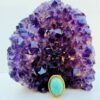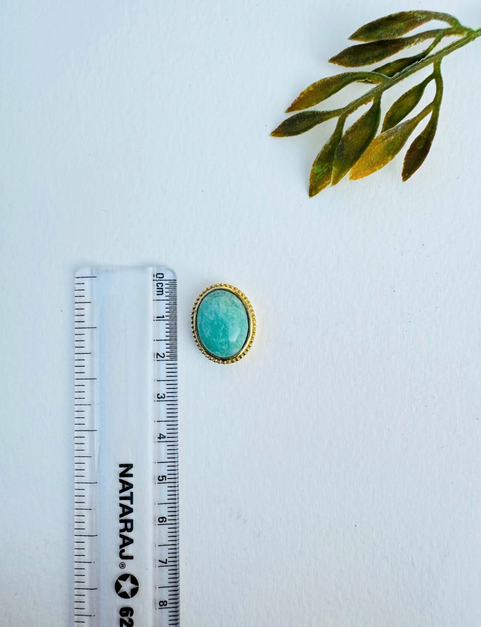 This oval amazonite groove stone features a polished natural cabochon in soft turquoise-green hues, framed by a classic brass bezel with a finely textured grooved edge. The stone’s natural marbling and color variations give each piece a unique, organic character.