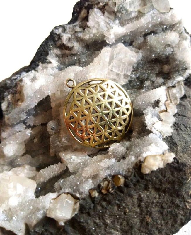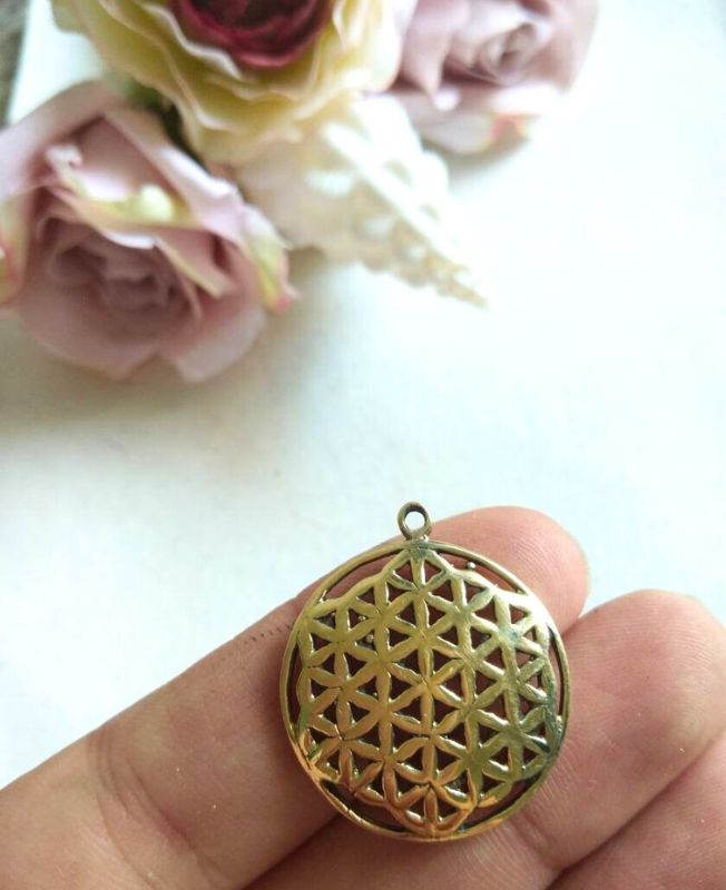 A striking hexagon-shaped brass pendant with a dense Flower of Life grid. Perfect for statement jewelry, energy-focused creations or mindful decor.