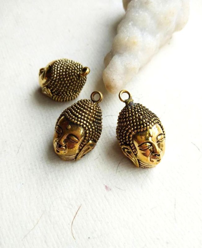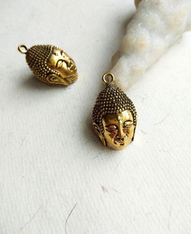 A detailed brass charm shaped as a serene Buddha head, perfect for spiritual jewelry, pendants, malas, or macrame projects.